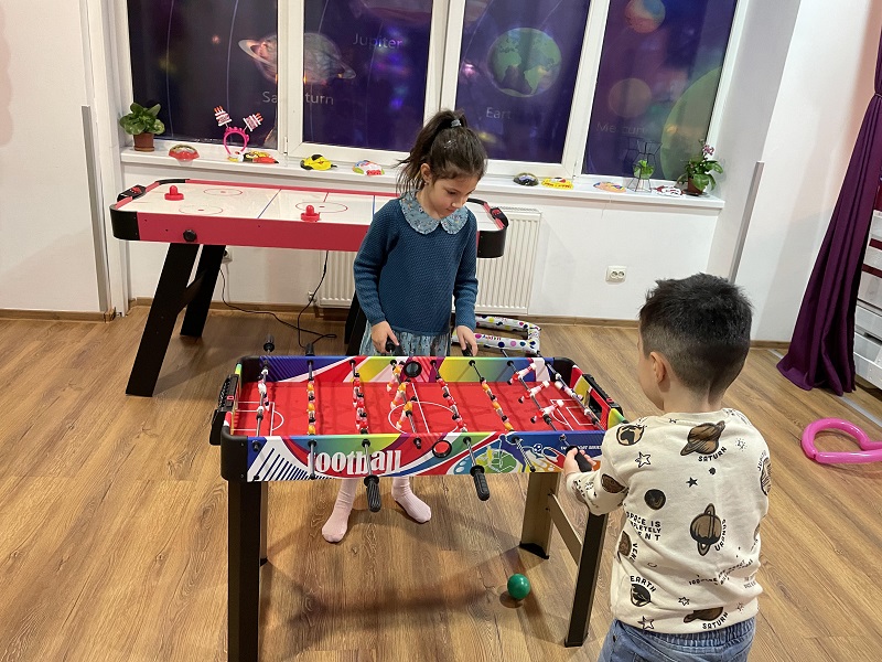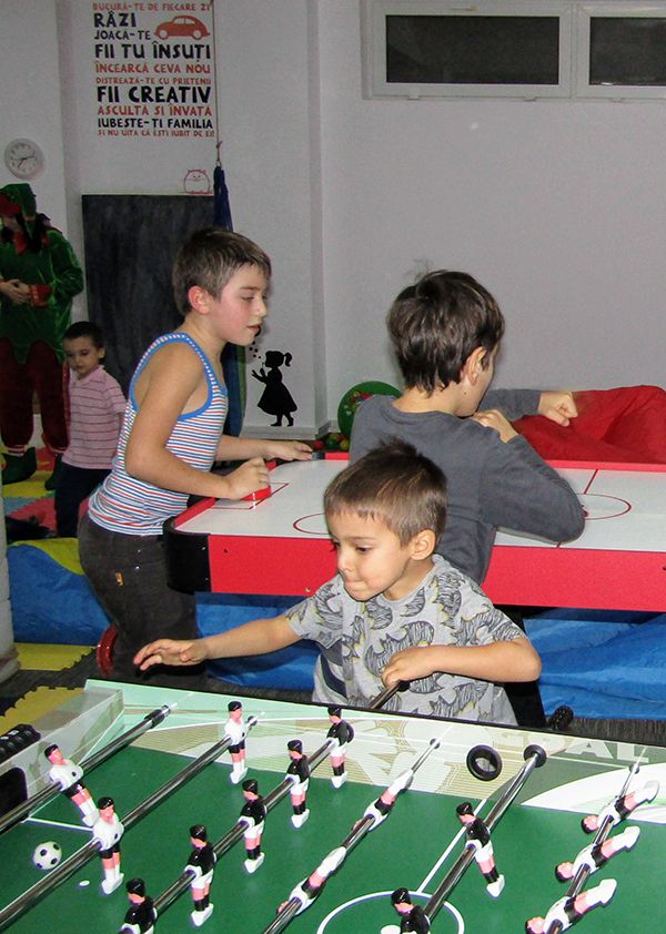 Masă fotbal, masă air hockey, darts, glob cu lumini disco, stație karaoke, proiector filme.Petrecerile sunt coordonate de un MC- maestru de ceremonii- cu experienţa, care va antrena toți copiii cu jocuri și dansuri.